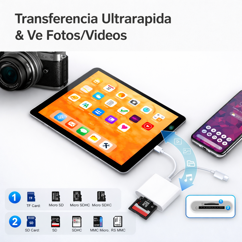 Con dos ranuras para tarjetas, este lector ofrece versatilidad y rapidez en la transferencia de archivos. Su conexión Lightning y USB-C garantiza compatibilidad con la mayoría de los dispositivos modernos, facilitando el acceso a tus fotos, videos y documentos en segundos.